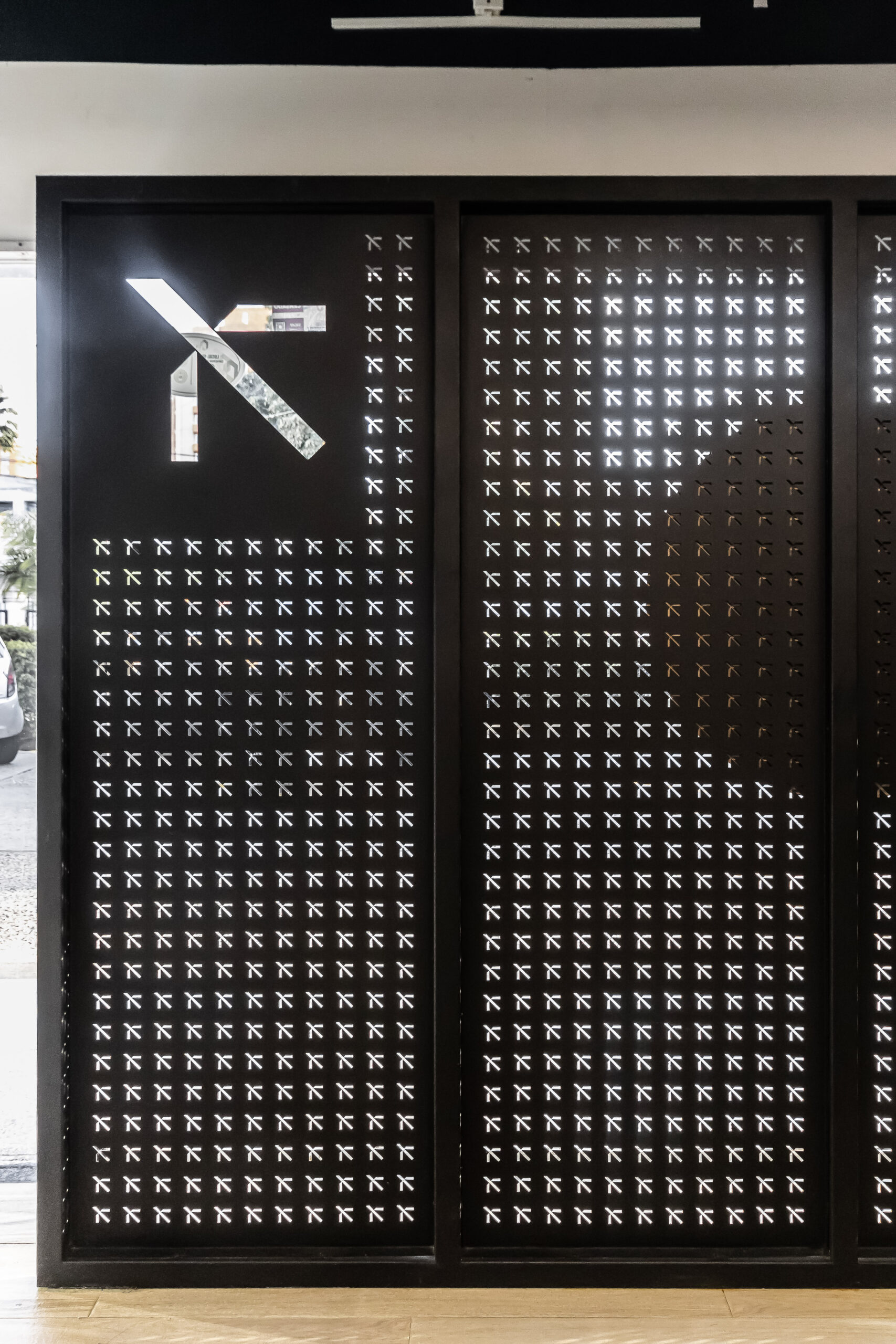 The storefront is defined by a perforated metal screen featuring the brand’s logo—serving both as a visual filter and a point of identity.