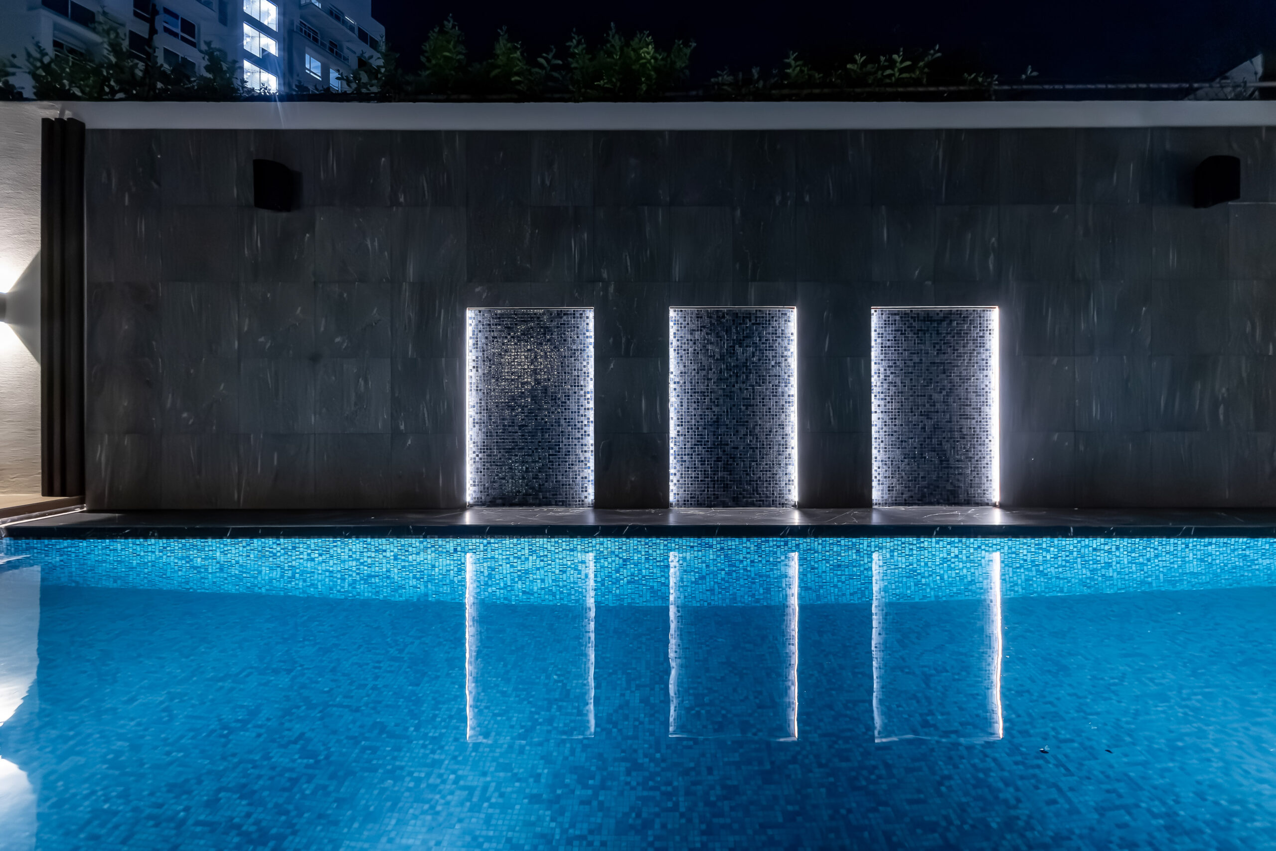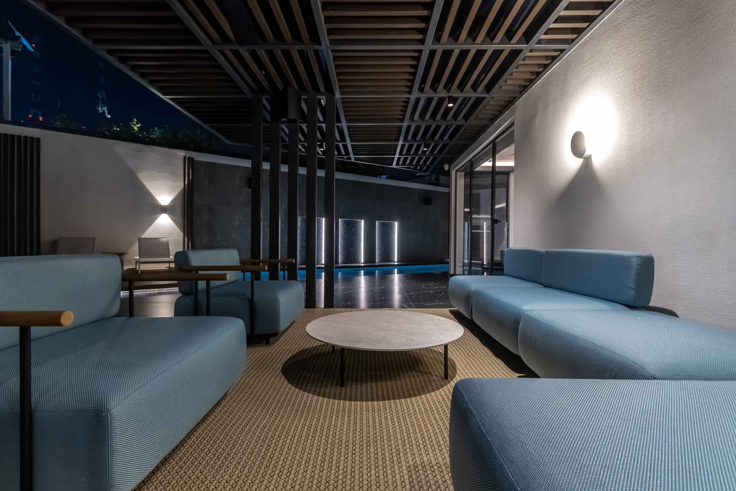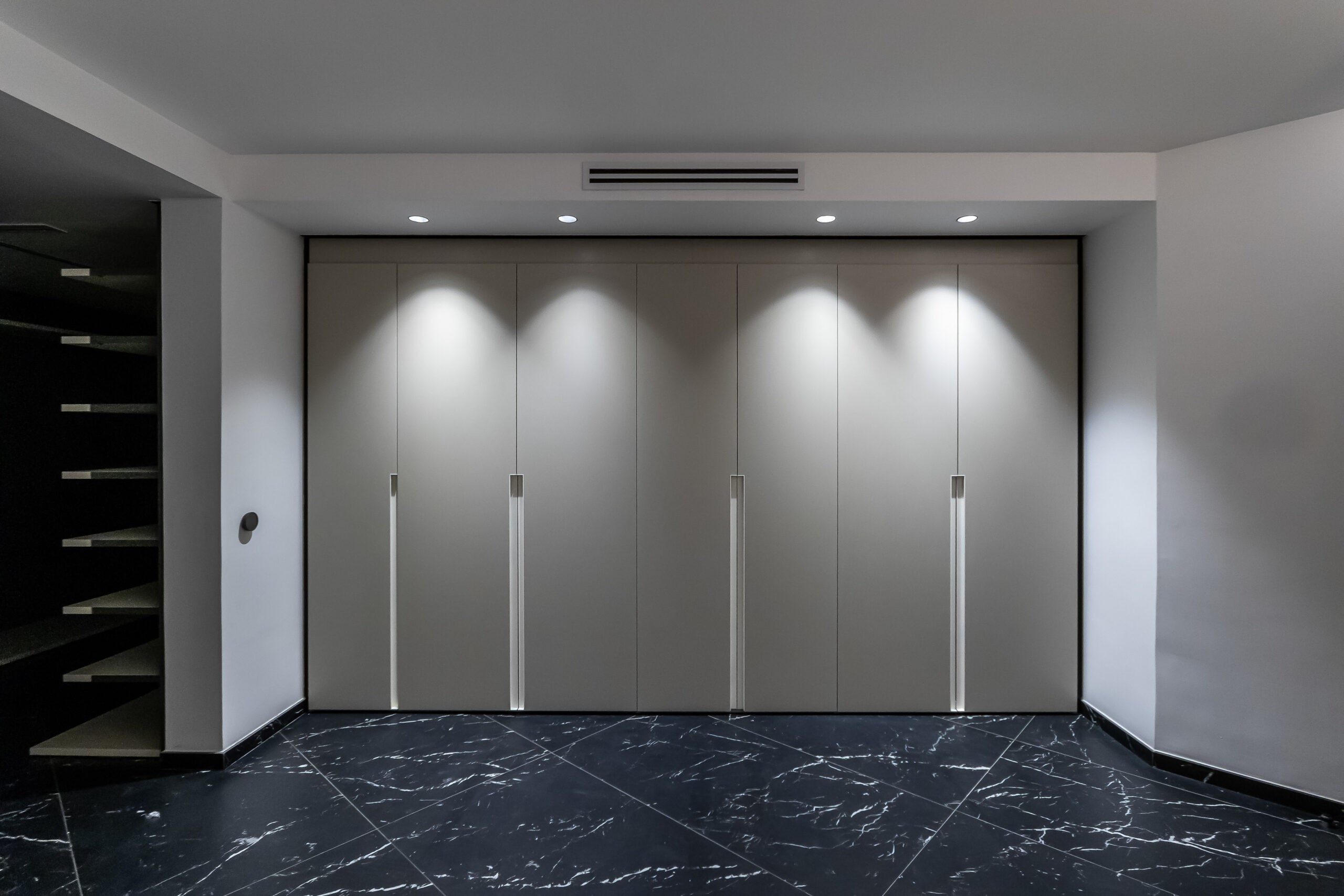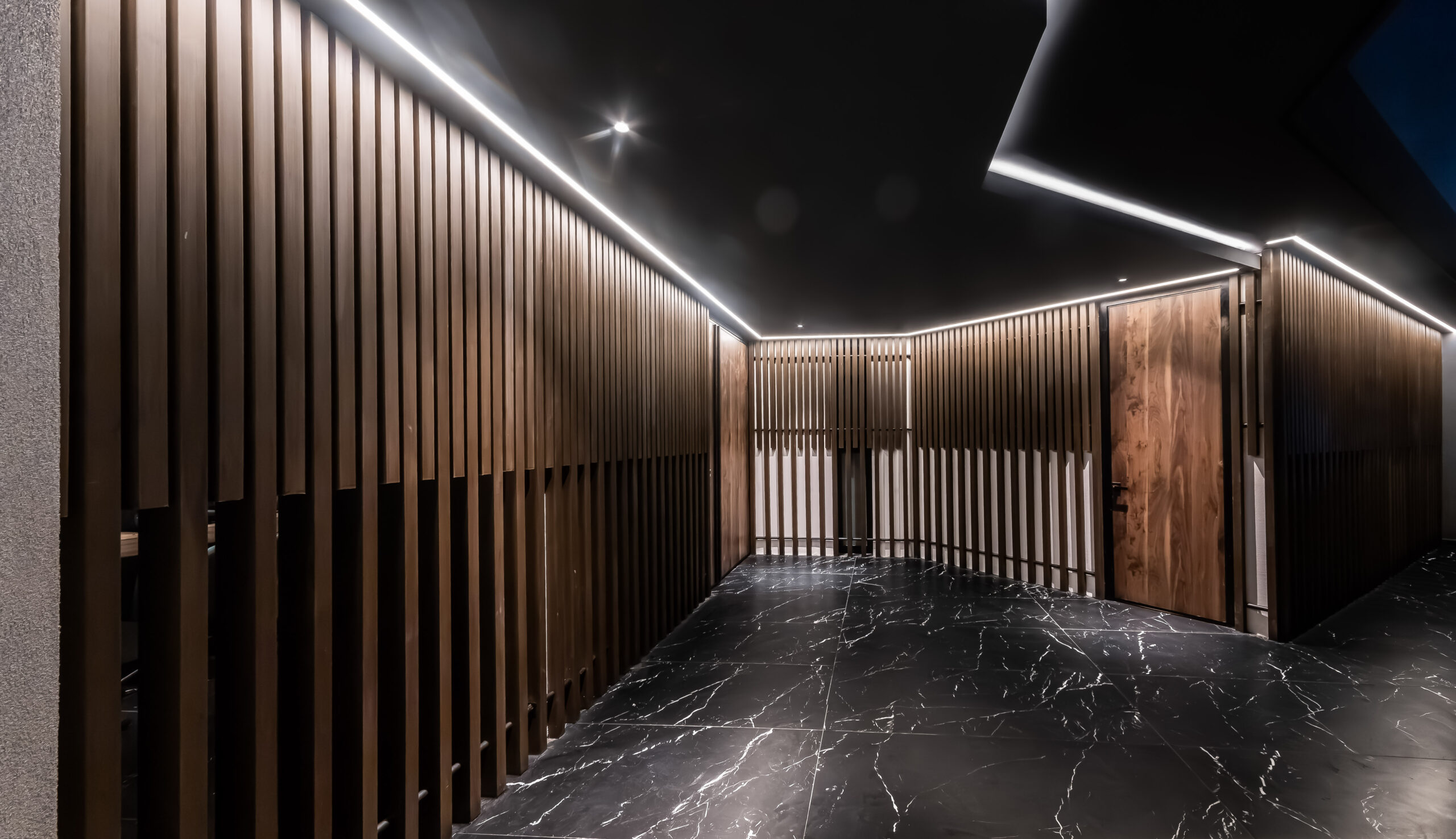 Strategically placed lighting enhances contrasts and adds depth without overwhelming the space.