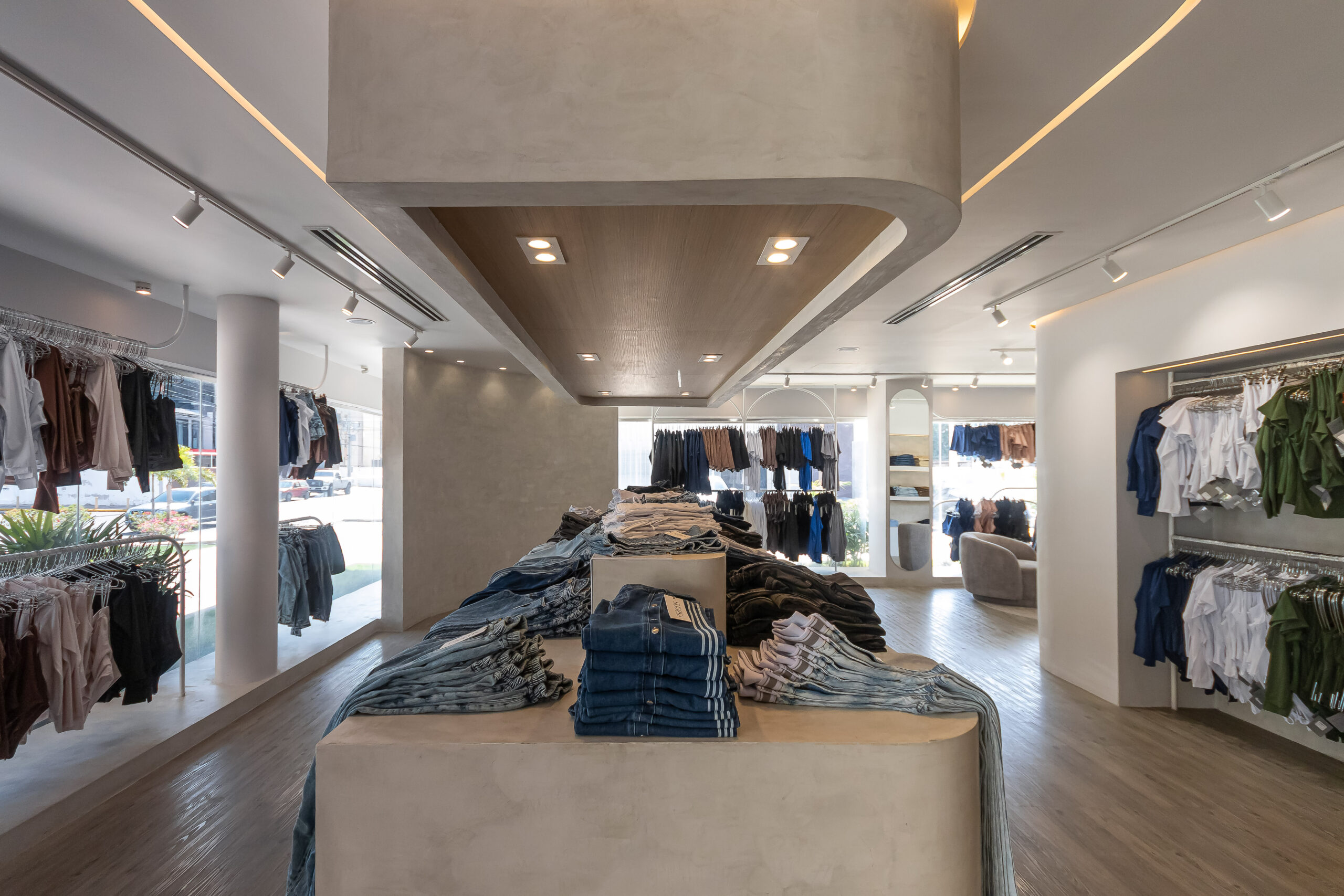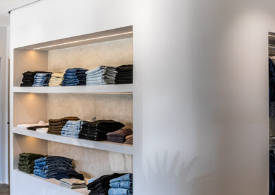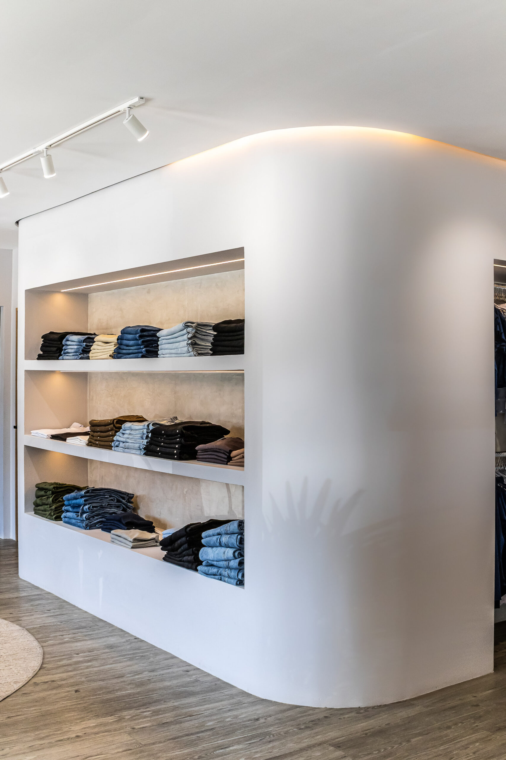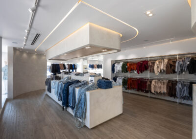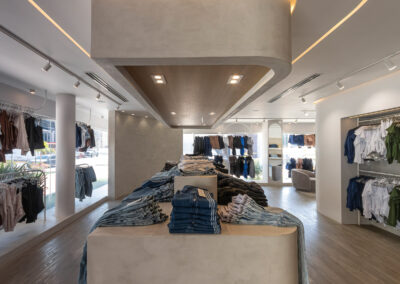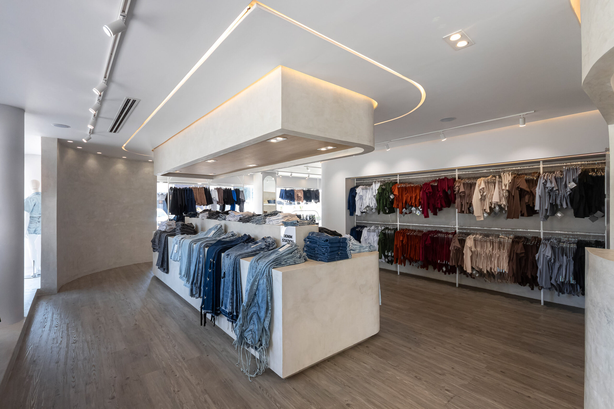 The interior design relies on a minimal material palette of stone, marble, and wood-like finishes—selected for their warmth and neutrality. These surfaces define a clean, quiet backdrop that emphasizes the geometry of the space and keeps the focus on the garments.